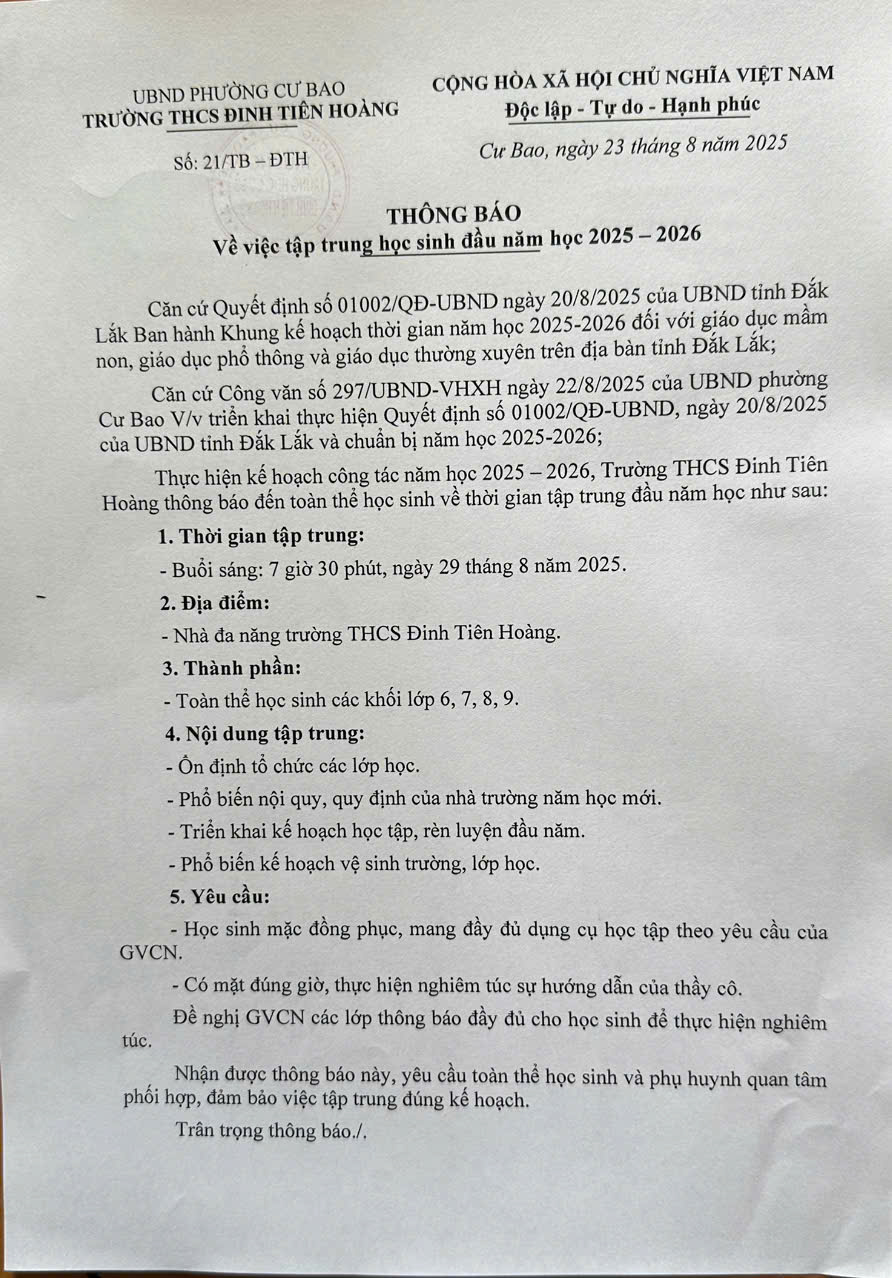 THÔNG BÁO VỀ VIỆC TẬP TRUNG HỌC SINH